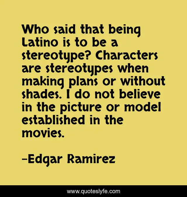 This page presents the quote "Who said that being Latino is to be a stereotype? Characters are stereotypes when making plans or without shades. I do not believe in the picture or model established in the movies.". Author of this quote is Edgar Ramirez. This quote is about believe, stereotypes,.
