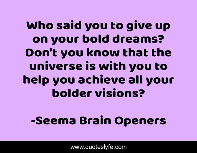 This page presents the quote "Who said you to give up on your bold dreams? Don't you know that the universe is with you to help you achieve all your bolder visions?". Author of this quote is Seema Brain Openers. This quote is about dreams, goals, vision,.