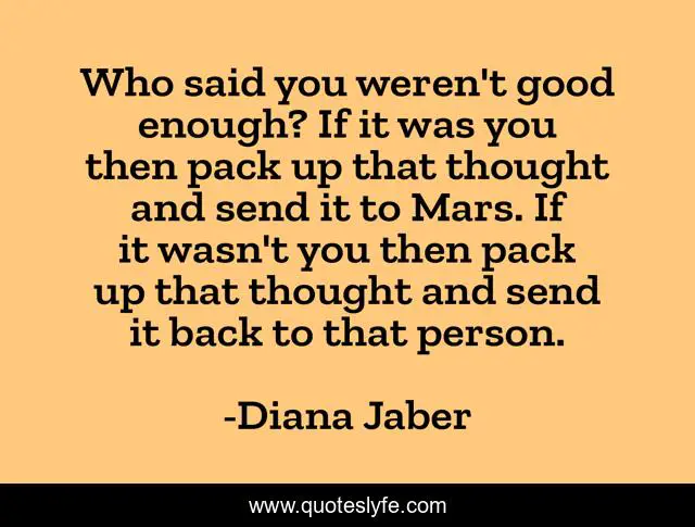 This page presents the quote "Who said you weren't good enough? If it was you then pack up that thought and send it to Mars. If it wasn't you then pack up that thought and send it back to that person.". Author of this quote is Diana Jaber. This quote is about confidence, life, truth, wisdom,.