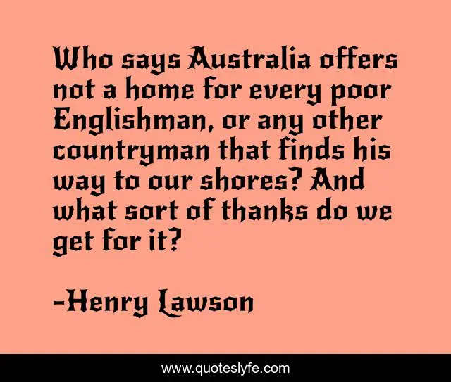 This page presents the quote "Who says Australia offers not a home for every poor Englishman, or any other countryman that finds his way to our shores? And what sort of thanks do we get for it?". Author of this quote is Henry Lawson. This quote is about poor, thanks, way,.