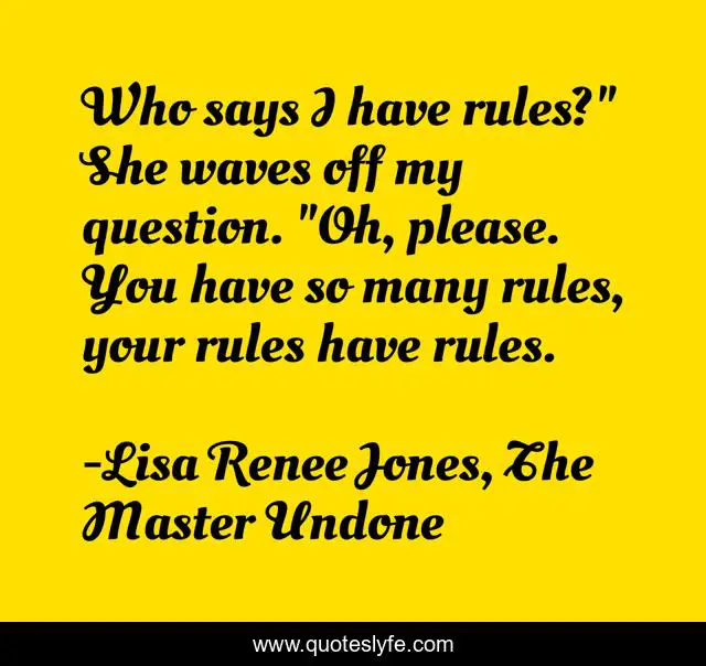 This page presents the quote "Who says I have rules?" She waves off my question. "Oh, please. You have so many rules, your rules have rules.". Author of this quote is Lisa Renee Jones, The Master Undone. .