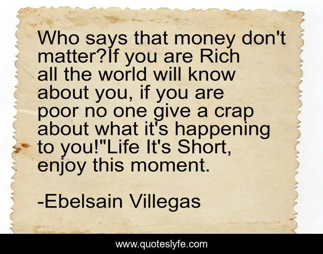 This page presents the quote "Who says that money don't matter?If you are Rich all the world will know about you, if you are poor no one give a crap about what it's happening to you!"Life It's Short, enjoy this moment.". Author of this quote is Ebelsain Villegas. This quote is about money, life, poor-people, moment, rich-people,.