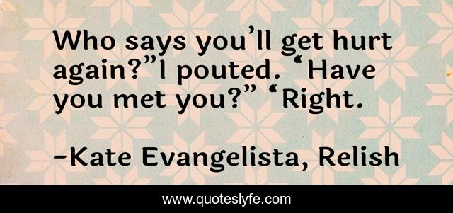 This page presents the quote "Who says you’ll get hurt again?”I pouted. “Have you met you?” “Right.". Author of this quote is Kate Evangelista, Relish. This quote is about dakota, conversation, luka, na,.