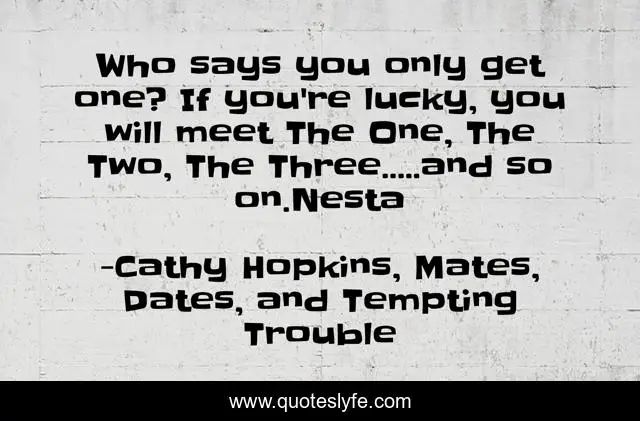 This page presents the quote "Who says you only get one? If you're lucky, you will meet The One, The Two, The Three.....and so on.Nesta". Author of this quote is Cathy Hopkins, Mates, Dates, and Tempting Trouble. This quote is about funny, comedy, soul-mates, the-one,.
