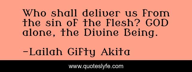 This page presents the quote "Who shall deliver us from the sin of the flesh? GOD alone, the Divine Being.". Author of this quote is Lailah Gifty Akita. This quote is about christain, forgiveness, sin, god, deliverance,.