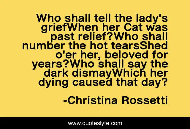 This page presents the quote "Who shall tell the lady's griefWhen her Cat was past relief?Who shall number the hot tearsShed o'er her, beloved for years?Who shall say the dark dismayWhich her dying caused that day?". Author of this quote is Christina Rossetti. This quote is about death, pet, death-of-a-pet, cat, cats, pets,.