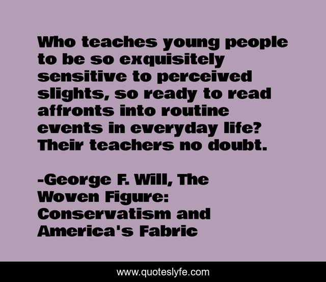 This page presents the quote "Who teaches young people to be so exquisitely sensitive to perceived slights, so ready to read affronts into routine events in everyday life? Their teachers no doubt.". Author of this quote is George F. Will, The Woven Figure: Conservatism and America's Fabric. This quote is about parenthood, modeling, discipleship, resilience, perception,.