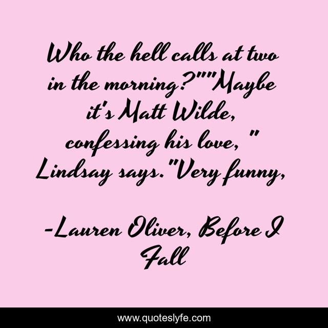 This page presents the quote "Who the hell calls at two in the morning?""Maybe it's Matt Wilde, confessing his love, " Lindsay says."Very funny, ". Author of this quote is Lauren Oliver, Before I Fall. This quote is about humor, laughs, sarcasm,.
