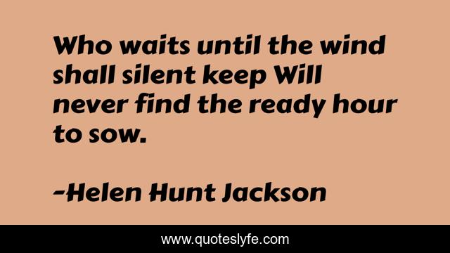 This page presents the quote "Who waits until the wind shall silent keep Will never find the ready hour to sow.". Author of this quote is Helen Hunt Jackson. This quote is about going, getting,.