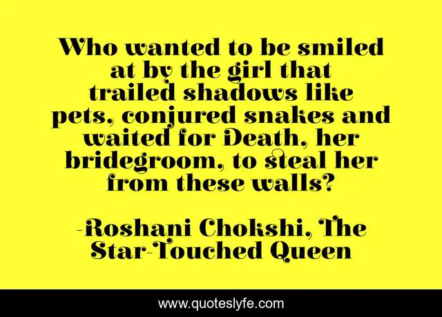 This page presents the quote "Who wanted to be smiled at by the girl that trailed shadows like pets, conjured snakes and waited for Death, her bridegroom, to steal her from these walls?". Author of this quote is Roshani Chokshi, The Star-Touched Queen. This quote is about fractured-folk-tale, death, paranormal-romance,.
