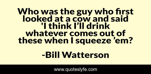 This page presents the quote "Who was the guy who first looked at a cow and said 'I think I’ll drink whatever comes out of these when I squeeze ’em?". Author of this quote is Bill Watterson. .