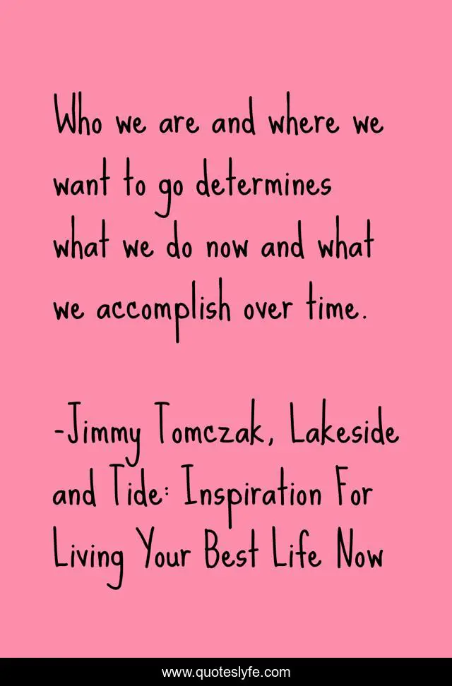 This page presents the quote "Who we are and where we want to go determines what we do now and what we accomplish over time.". Author of this quote is Jimmy Tomczak, Lakeside and Tide: Inspiration For Living Your Best Life Now. This quote is about journaling, spirituality, self-improvement, inspirational, self-help, enthusiasm,.