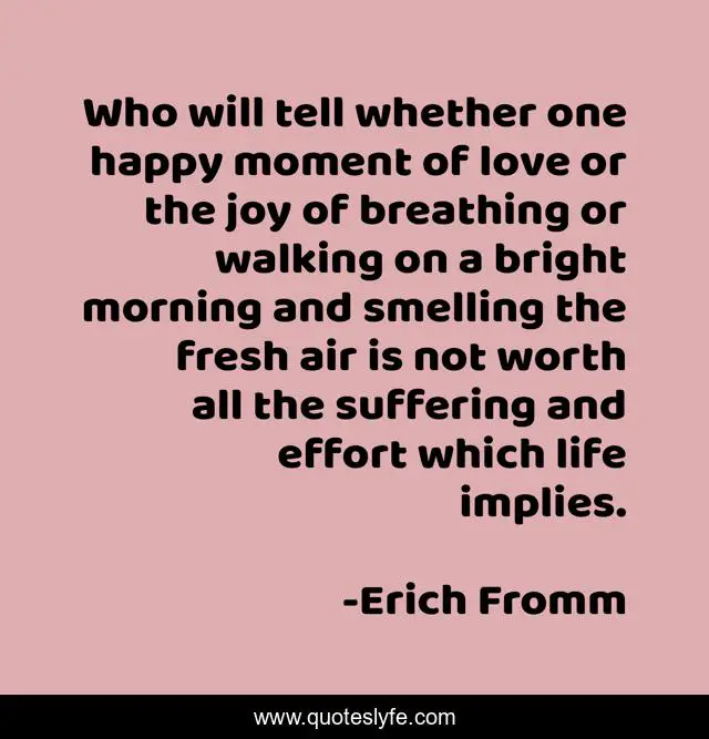 This page presents the quote "Who will tell whether one happy moment of love or the joy of breathing or walking on a bright morning and smelling the fresh air is not worth all the suffering and effort which life implies.". Author of this quote is Erich Fromm. .