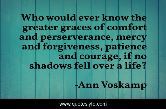 This page presents the quote "Who would ever know the greater graces of comfort and perserverance, mercy and forgiveness, patience and courage, if no shadows fell over a life?". Author of this quote is Ann Voskamp. This quote is about spirituality, christianity,.
