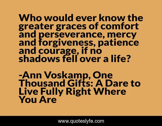 This page presents the quote "Who would ever know the greater graces of comfort and perseverance, mercy and forgiveness, patience and courage, if no shadows fell over a life?". Author of this quote is Ann Voskamp, One Thousand Gifts: A Dare to Live Fully Right Where You Are. This quote is about shadows, mercy, life, perseverance, comfort, patience, courage, forgiveness, grace,.