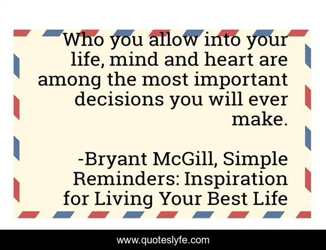 "Bryant McGill, Simple Reminders: Inspiration for Living Your Best Life Quotes." Quoteslyfe.com, 2025. Sun. 07 Dec. 2025. <https://www.quoteslyfe.com/quote/Who-you-allow-into-your-life-mind-198707>.