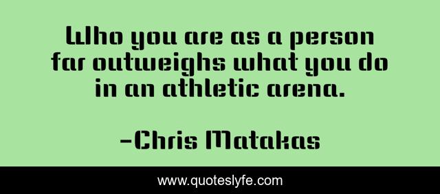 This page presents the quote "Who you are as a person far outweighs what you do in an athletic arena.". Author of this quote is Chris Matakas. This quote is about athletics, inspiration, life, life-lessons, sports,.