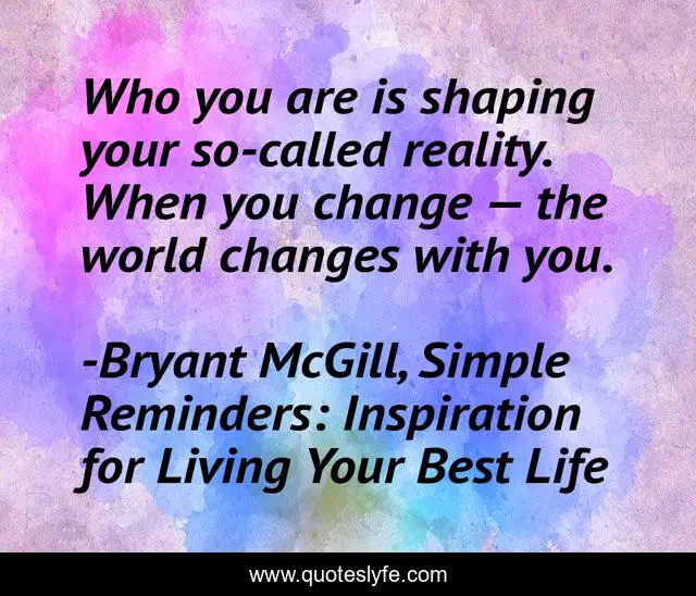 This page presents the quote "Who you are is shaping your so-called reality. When you change — the world changes with you.". Author of this quote is Bryant McGill, Simple Reminders: Inspiration for Living Your Best Life. This quote is about shaping, change, reality,.