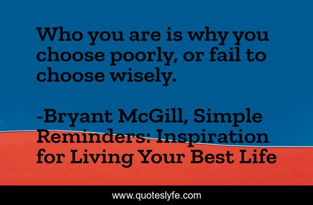 This page presents the quote "Who you are is why you choose poorly, or fail to choose wisely.". Author of this quote is Bryant McGill, Simple Reminders: Inspiration for Living Your Best Life. This quote is about failures, choices, wisdom,.