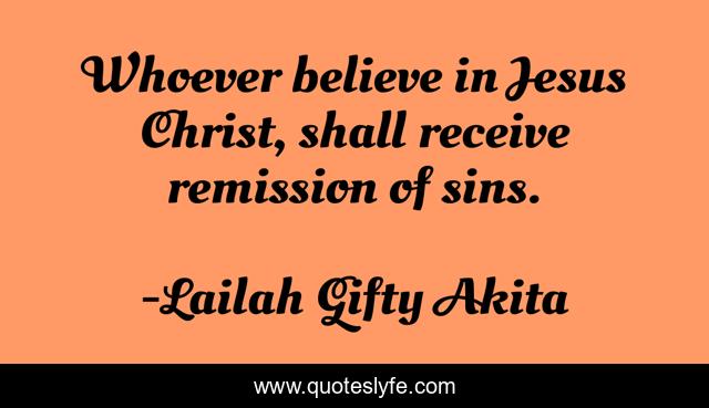 This page presents the quote "Whoever believe in Jesus Christ, shall receive remission of sins.". Author of this quote is Lailah Gifty Akita. This quote is about jesus-christ, christian, believe, forgiveness, sins,.