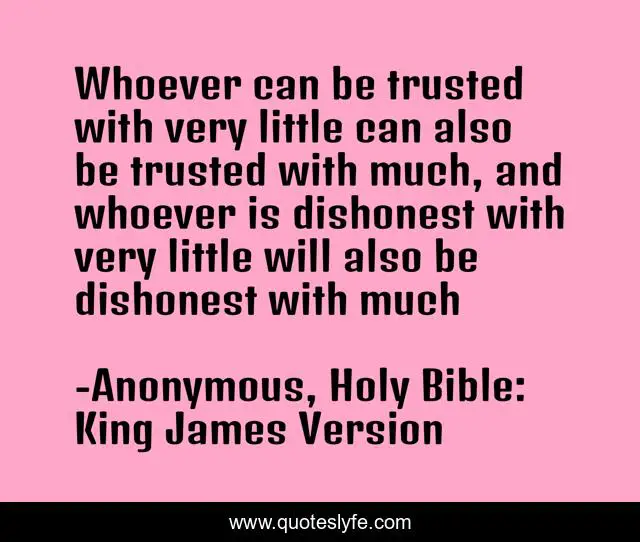This page presents the quote "Whoever can be trusted with very little can also be trusted with much, and whoever is dishonest with very little will also be dishonest with much". Author of this quote is Anonymous, Holy Bible: King James Version. .