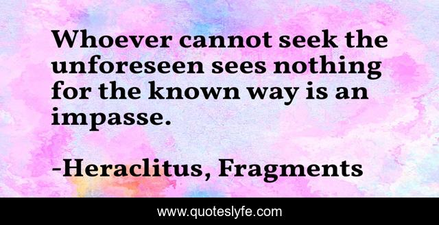 This page presents the quote "Whoever cannot seek the unforeseen sees nothing for the known way is an impasse.". Author of this quote is Heraclitus, Fragments. This quote is about philosophy, heraclitus, wisdom,.