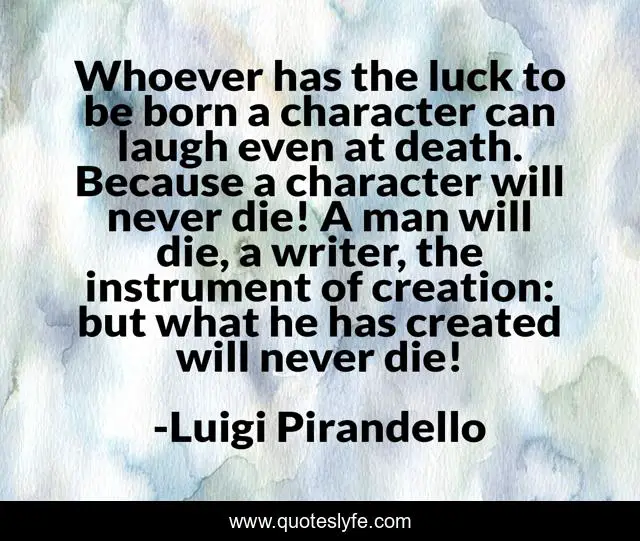 This page presents the quote "Whoever has the luck to be born a character can laugh even at death. Because a character will never die! A man will die, a writer, the instrument of creation: but what he has created will never die!". Author of this quote is Luigi Pirandello. This quote is about man, character, luck,.