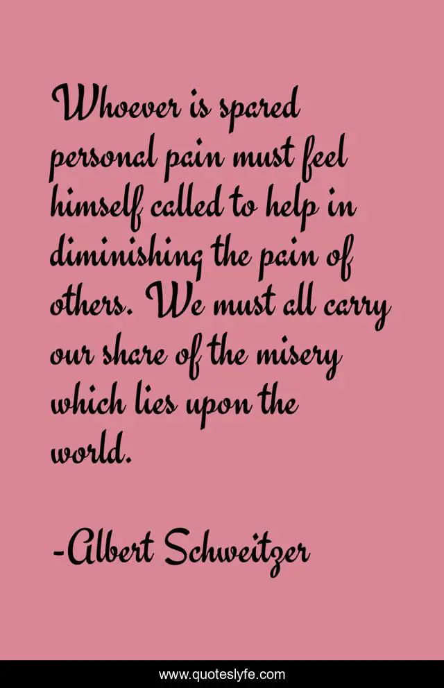 This page presents the quote "Whoever is spared personal pain must feel himself called to help in diminishing the pain of others. We must all carry our share of the misery which lies upon the world.". Author of this quote is Albert Schweitzer. This quote is about pain, misery,.
