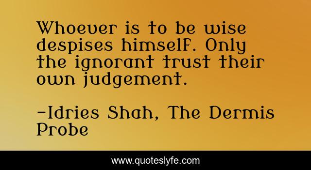 This page presents the quote "Whoever is to be wise despises himself. Only the ignorant trust their own judgement.". Author of this quote is Idries Shah, The Dermis Probe. This quote is about proverb, sufis, delusion, ego, sufism,.