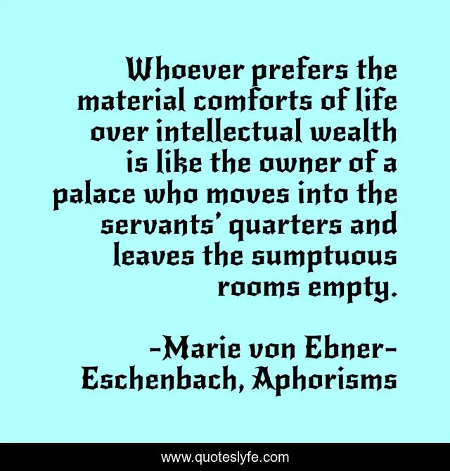 This page presents the quote "Whoever prefers the material comforts of life over intellectual wealth is like the owner of a palace who moves into the servants’ quarters and leaves the sumptuous rooms empty.". Author of this quote is Marie von Ebner-Eschenbach, Aphorisms. This quote is about intelligence, intellectual, materialism,.