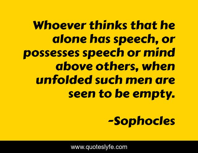 This page presents the quote "Whoever thinks that he alone has speech, or possesses speech or mind above others, when unfolded such men are seen to be empty.". Author of this quote is Sophocles. This quote is about mind, men, speech,.