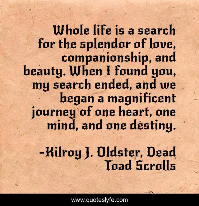 This page presents the quote "Whole life is a search for the splendor of love, companionship, and beauty. When I found you, my search ended, and we began a magnificent journey of one heart, one mind, and one destiny.". Author of this quote is Kilroy J. Oldster, Dead Toad Scrolls. This quote is about love, destiny, beauty, journey-of-life, one-heart, companionship, affection, love-and-sayings,.