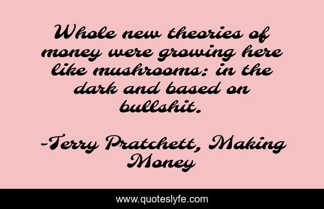This page presents the quote "Whole new theories of money were growing here like mushrooms: in the dark and based on bullshit.". Author of this quote is Terry Pratchett, Making Money. This quote is about funny, comedy, ideas,.