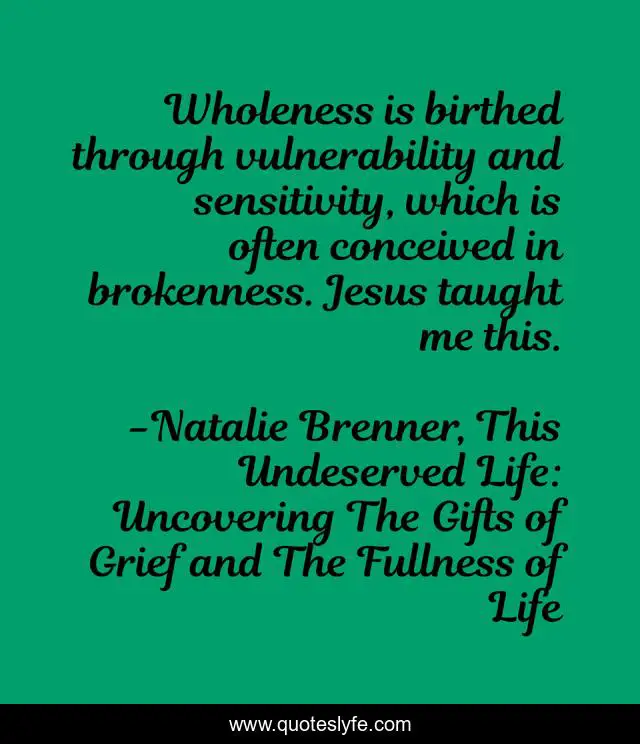 "Natalie Brenner, This Undeserved Life: Uncovering The Gifts of Grief and The Fullness of Life Quotes." Quoteslyfe.com, 2025. Fri. 05 Dec. 2025. <https://www.quoteslyfe.com/quote/Wholeness-is-birthed-through-vulnerability-and-sensitivity-134321>.