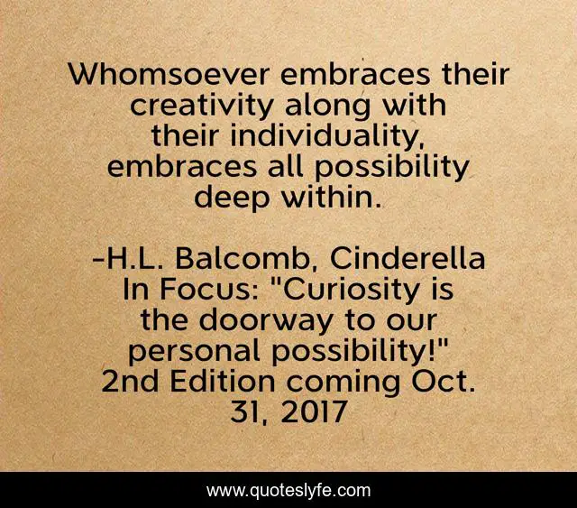 "H.L. Balcomb, Cinderella In Focus: "Curiosity is the doorway to our personal possibility!" 2nd Edition coming Oct. 31, 2017 Quotes." Quoteslyfe.com, 2025. Mon. 08 Dec. 2025. <https://www.quoteslyfe.com/quote/Whomsoever-embraces-their-creativity-along-with-their-108154>.