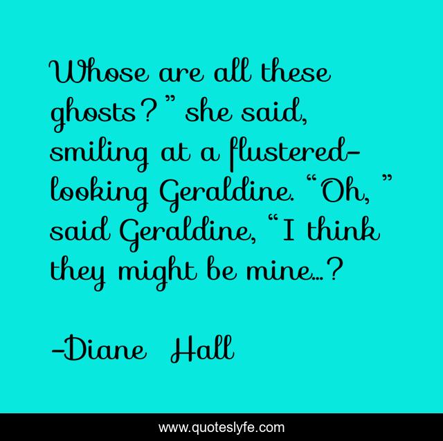 This page presents the quote "Whose are all these ghosts?” she said, smiling at a flustered-looking Geraldine. “Oh, ” said Geraldine, “I think they might be mine...?". Author of this quote is Diane Hall. This quote is about love, angels, soulmates, paranormal-romance, twin-flames, life-after-death, re-incarnation, psychics, ghosts,.