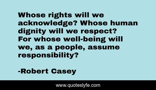 This page presents the quote "Whose rights will we acknowledge? Whose human dignity will we respect? For whose well-being will we, as a people, assume responsibility?". Author of this quote is Robert Casey. This quote is about responsibility, people,.