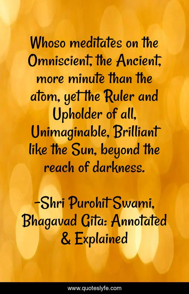 "Shri Purohit Swami, Bhagavad Gita: Annotated & Explained Quotes." Quoteslyfe.com, 2025. Mon. 08 Dec. 2025. <https://www.quoteslyfe.com/quote/Whoso-meditates-on-the-Omniscient-the-Ancient-249210>.