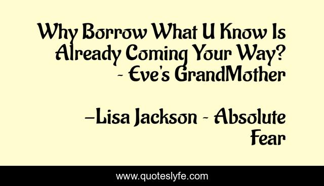 This page presents the quote "Why Borrow What U Know Is Already Coming Your Way? ~ Eve's GrandMother". Author of this quote is Lisa Jackson ~ Absolute Fear. This quote is about life-wisdom, wisdom, inspirational, life-lessons, enthusiasm,.