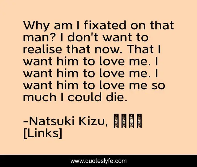 This page presents the quote "Why am I fixated on that man? I don't want to realise that now. That I want him to love me. I want him to love me. I want him to love me so much I could die.". Author of this quote is Natsuki Kizu, リンクス [Links]. This quote is about love, natsuki-kizu, kiss, kissing, manga, affection,.