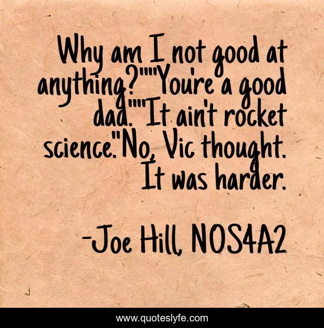This page presents the quote "Why am I not good at anything?""You're a good dad.""It ain't rocket science."No, Vic thought. It was harder.". Author of this quote is Joe Hill, NOS4A2. .