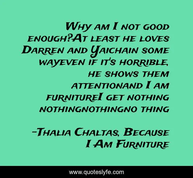 This page presents the quote "Why am I not good enough?At least he loves Darren and Yaichain some wayeven if it's horrible, he shows them attentionand I am furnitureI get nothing nothingnothingno thing". Author of this quote is Thalia Chaltas, Because I Am Furniture. This quote is about ya, young-adult-fiction, abuse,.