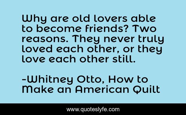This page presents the quote "Why are old lovers able to become friends? Two reasons. They never truly loved each other, or they love each other still.". Author of this quote is Whitney Otto, How to Make an American Quilt. This quote is about friendship, love, affection, exes,.