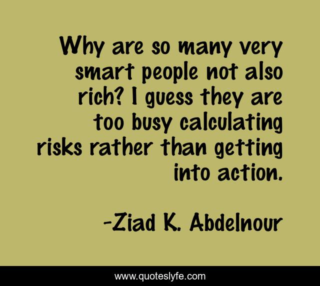 This page presents the quote "Why are so many very smart people not also rich? I guess they are too busy calculating risks rather than getting into action.". Author of this quote is Ziad K. Abdelnour. This quote is about rich, risks, smart,.