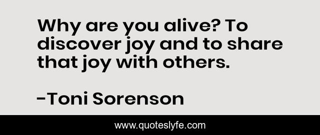 This page presents the quote "Why are you alive? To discover joy and to share that joy with others.". Author of this quote is Toni Sorenson. This quote is about joy, life, meaning,.