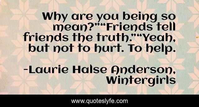 This page presents the quote "Why are you being so mean?”“Friends tell friends the truth.”“Yeah, but not to hurt. To help.". Author of this quote is Laurie Halse Anderson, Wintergirls. This quote is about friends, truth, hurt,.