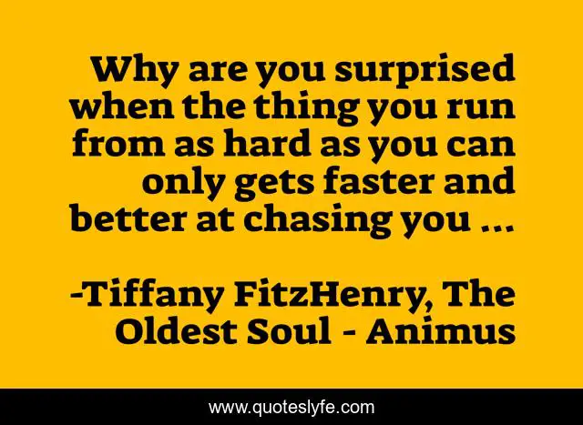 This page presents the quote "Why are you surprised when the thing you run from as hard as you can only gets faster and better at chasing you ...". Author of this quote is Tiffany FitzHenry, The Oldest Soul - Animus. This quote is about spirituality, young-adult-fiction, young-adult-fantasy,.