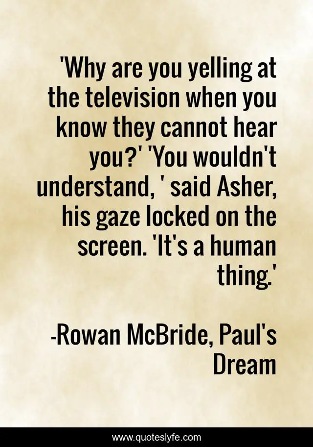 "Rowan McBride, Paul's Dream Quotes." Quoteslyfe.com, 2025. Fri. 05 Dec. 2025. <https://www.quoteslyfe.com/quote/Why-are-you-yelling-at-the-television-244218>.