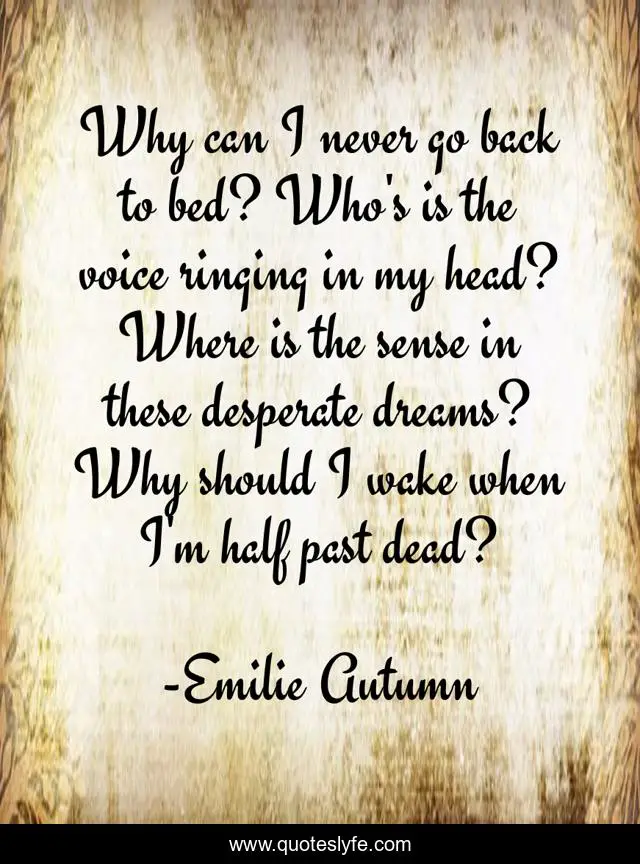This page presents the quote "Why can I never go back to bed? Who's is the voice ringing in my head? Where is the sense in these desperate dreams? Why should I wake when I'm half past dead?". Author of this quote is Emilie Autumn. This quote is about insomnia, sleep, insanity, wake, reality,.