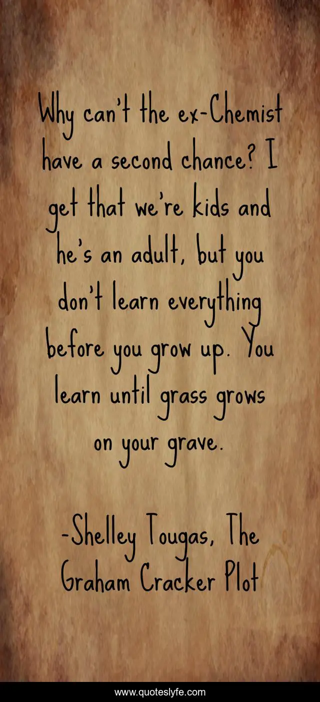 This page presents the quote "Why can't the ex-Chemist have a second chance? I get that we're kids and he's an adult, but you don't learn everything before you grow up. You learn until grass grows on your grave.". Author of this quote is Shelley Tougas, The Graham Cracker Plot. This quote is about second-chance, learning,.